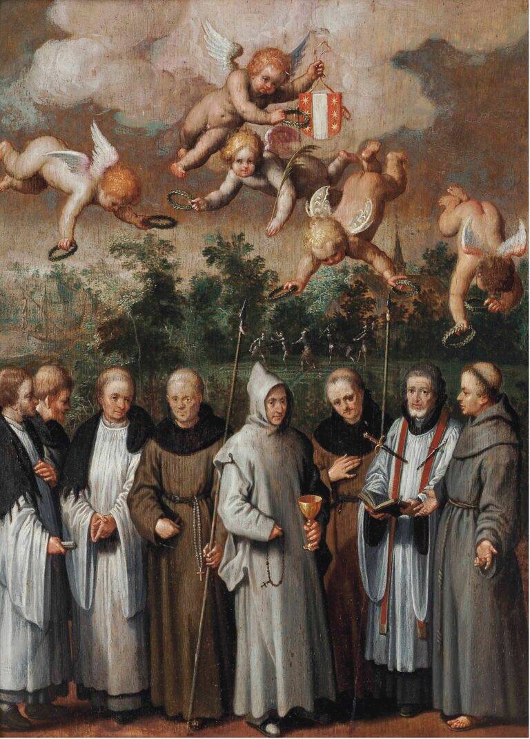 Het zoekgeraakte schilderij met de martelaren van Gouda (36.1 x 26.6 cm). Zij kwamen om bij de inval van de geuzen in Gouda. Op de achtergrond de kasteeltuin met de toren van de kapel van de minderbroederkloost. In de tuin soldaten die jacht maken op collatiebroeders, die op de voorgrond Justus van Scoonhoven flankeren op de voorgrond. Mogelijk is de tweede van links Gaspar Arnoldi die met een paard van Schoonhoven werd gesleept en aan de ra van een schip in de IJssel werd opgehangen (links op de achtergrond afgebeeld). De paters naast hem kunnen Jacob Willemsz Cruik en Corneliszoon zijn uit klooster de Hem in Bergambacht tegen Schoonhoven aan de Lek. De priester met dolk in zijn borst kan Dierck Gerrtitsz zijn, rechts van hem staat fransiscaan Wim ter Gouw. Beiden afkomstig uit Gouda en door geuzentroepen onder Lumey vermoord in Geertruidenberg (bron Paul Abels).