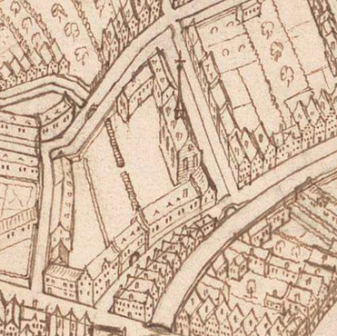 Het klooster is goed zichtbaar op plattegronden van Gouda die dateert van voor de sloop van het klooster (Rijksmuseum).